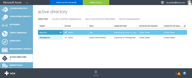 If you have not created an Azure AD directory, you can add an Azure AD directory in the Azure Management Portal. Select the Active Directory extension on the left and click Add.