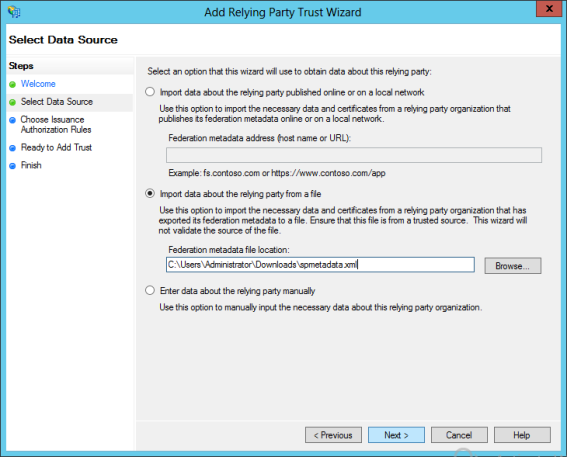 In the Select Data Source, select the Import data about the relying party from a file option. Click Browse to locate the metadata file that you just downloaded - for example,