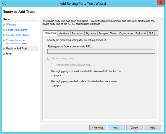 In the Ready to Add Trust, under the Monitoring tab, leave the fields as they are, and then click Next.