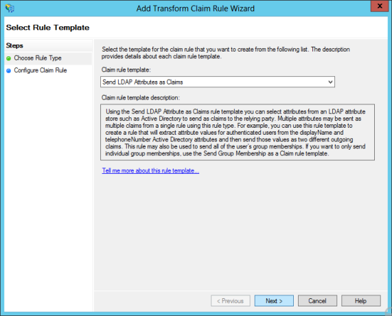 From the Claim rule template list, select the Send LDAP Attributes as Claims, and then click Next.