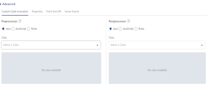 Configure the parameters for the preprocessor and postprocessor to filter the request and response objects for your business requirements. You can specify the Java class name or custom JavaScript code or Rules for preprocessor and postprocessor. Java class names contain the preprocessor and postprocessor.