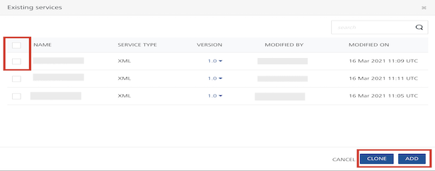 - Select the check box for the desired services. If you want add or clone more than one service, select the required check boxes from the existing services.