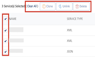 Select one or more the check boxes for services. The quick access bar for the selected services appears with actions such as Clear All, Clone, Unlink, Delete.