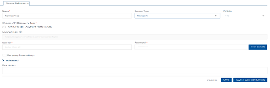 Note: In Volt MX Foundry Console, you can provide login credentials of MuleSoft or upload a RAML file to configure an integration service.