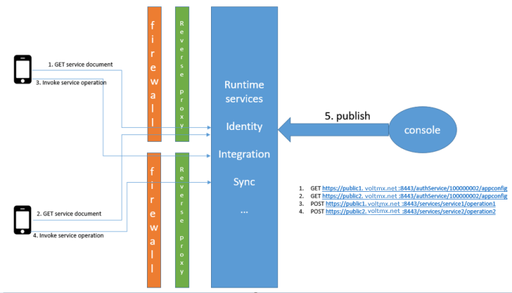 In case of on-premises, if your Volt MX Foundry is installed behind a reverse proxy and registered using a private URL or IP, you will need to expose identity and services end-points as public URLs. A reverse proxy is configured for exposing public URLs and then routing them to private Volt MX Foundry URLs. When you create an Identity or Integration service, which is installed behind a reverse proxy, on Console, the service endpoints are exposed via intranet or private URLs during design time. You can access the service, however, via public URLs at runtime.