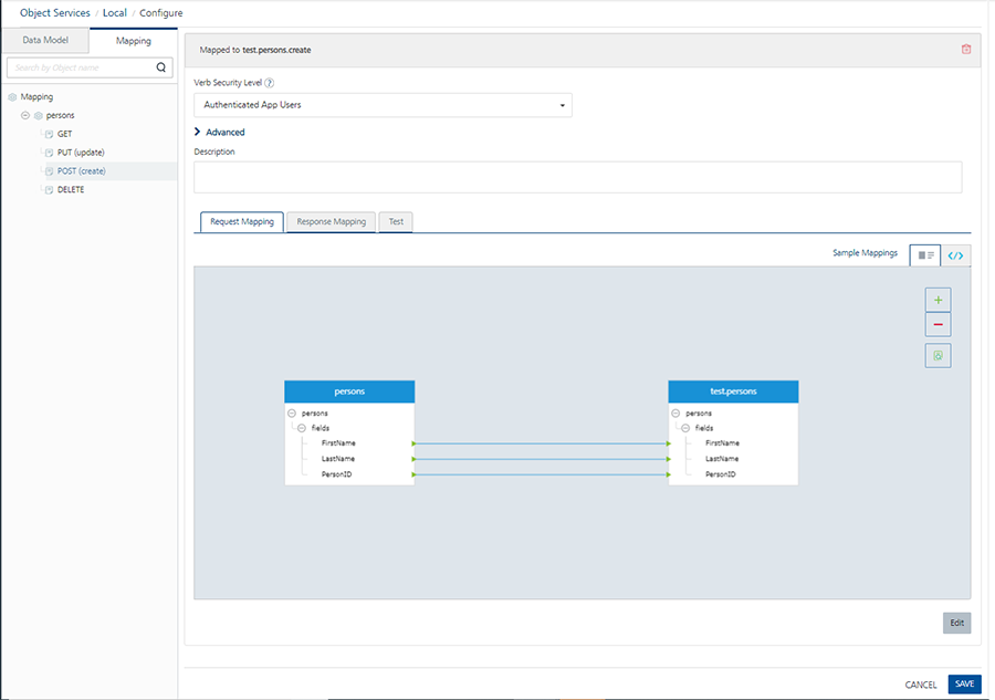 - In the navigation pane, click the Mapping tab, and then click the plus button next to the an object. For example, Teacher.