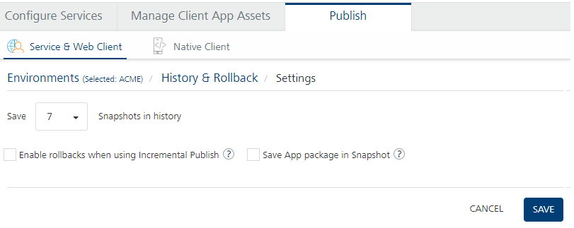 - Snapshots created during Incremental publish cannot be used for rollback, as they contain only delta services/jars information. To enable rollback capability for snapshots captured during incremental publish, you must select the Enable rollbacks when using Incremental publish check box.
