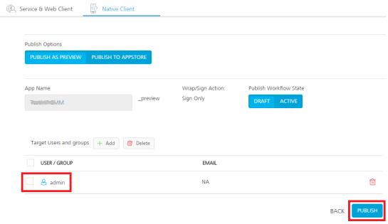 <Appname>_preview. Preview apps are always sign only and can be installed on the same device alongside the production copy of the same app. These apps will be displayed as<Appname>_previewon user devices or spring board. - To publish an app as a production copy, follow these steps: