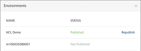 The Environments dialog appears and displays the published environments names, and the service publish status.