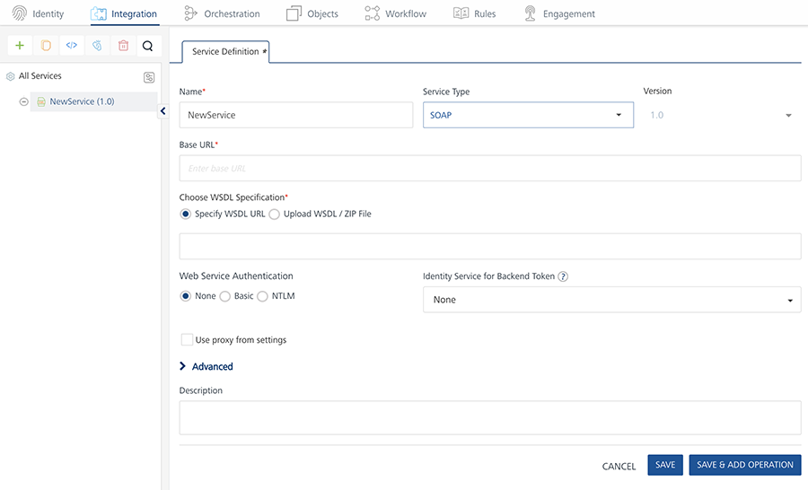To configure a SOAP service in Integration service definition tab, follow these steps:
