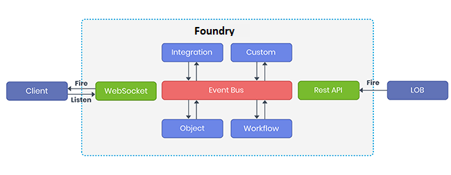 Volt MX Foundry exposes a WebSocket end point to subscribe/unsubscribe/raise an event from an external client. Volt MX Foundry also exposed a HTTP end point to fire an event from any external client. . Once the event is created, the service or business logic will finish executing it. Another service or custom business logic should be configured to handle that event and perform the desired action and this work will be executed in a different process on the server asynchronously.