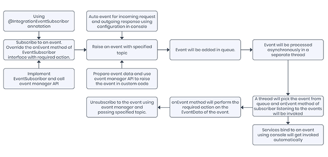 EventManager: This class is used to subscribe/unsubscribe to an event of a specified topic. You can access Event Manager using Services Manager API in their custom code.