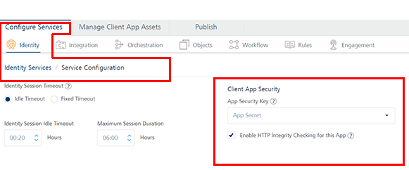 Volt MX Foundry supports configuring session timeout (idle timeout and fixed timeout) for an app identity session. In Apps, Volt MX Foundry supports configuration of Identity Session Idle Timeout that applies across all of your apps, as well as support for Enable HTTP Message Body Integrity Checking for an Application. The following procedures describe how to configure session timeout and client app security.