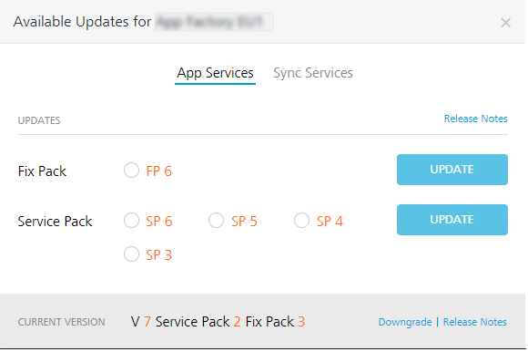 You can select the available latest fix pack version or a service pack version of app services or sync services and then click UPDATE.