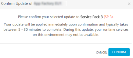 For example, Your update will be applied immediately upon confirmation and typically takes between 5 - 30 minutes to complete. During this update, your runtime services on this environment may not be available.