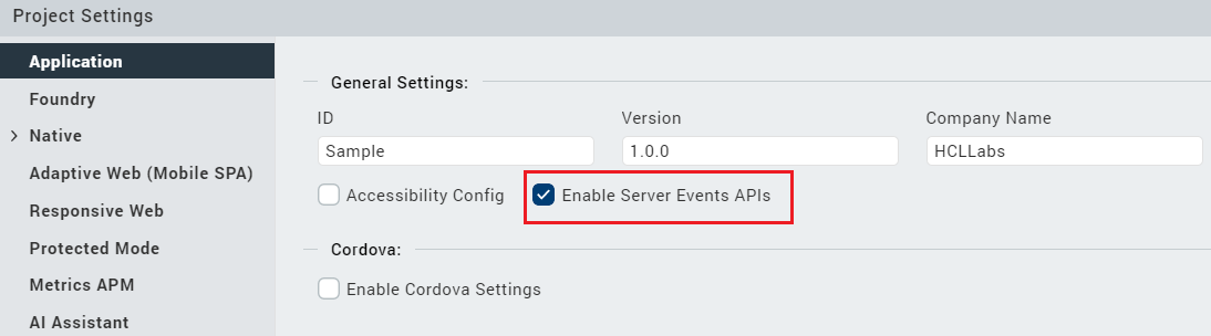 - On the Project Settings window, in the Application section, select Enable Server Events APIs.