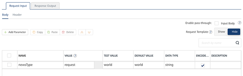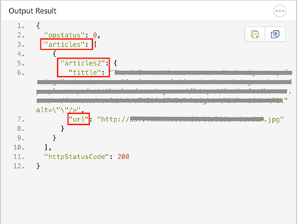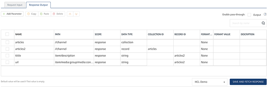 Name/ID XPath Scope Data Type Collection ID Record ID articles //channel response Collection articles2 //channel response Record articles title item/title response Sting string articles2 url item/media:group/media:content/@url response Sting string articles2 Collection - A group of data, also referred to as data set. A collection contains only records, and a record contains a string, boolean, or number values. Record - A group data elements under the specified parameter. A record can also be part of a collection. Typically, a record provides metadata to a segment. Note: For JSON integration service, the back-end response will be in JSON format. JSONPath format should contain