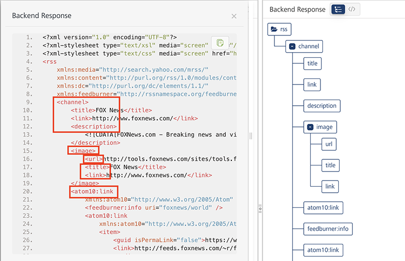 In Backend Response window, you can view the raw response as either raw data or in a tree format.