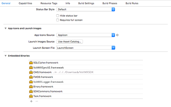 Now, add the remaining frameworks (shown in the following image) under the Embedded Binaries section in the General tab.