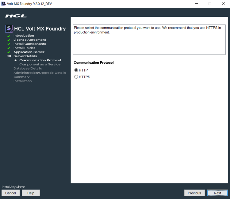 The HTTP or HTTPS window appears asking you to choose the HTTP or HTTPS. By default, this option is set to HTTP.