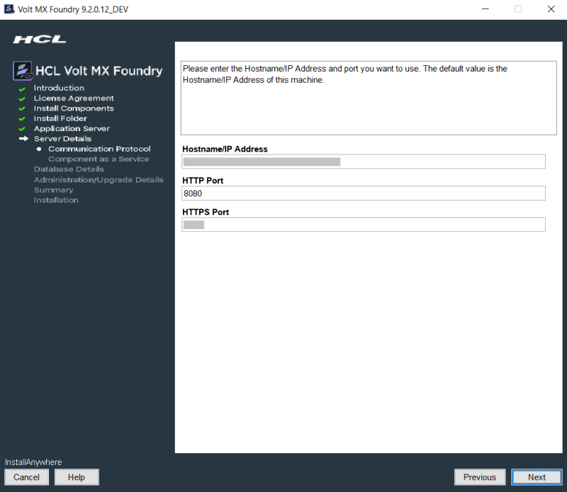 - Database Server Hostname/IP: Enter the DB server Hostname/IP to be used to create a database of selected components of Volt MX Foundry. By default, the server Hostname/IP is set as localhost.