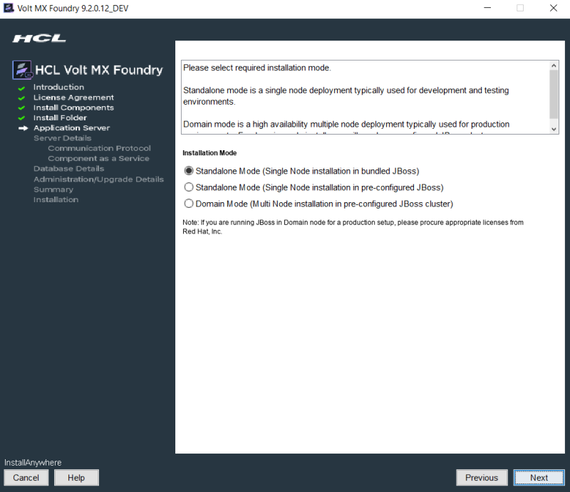 - Standalone Mode (Single Node installation in Bundled JBoss): To install Volt MX Foundry on single node on JBoss that is bundled with the Volt MX Foundry installer, click (Single Node installation in Bundled JBoss).