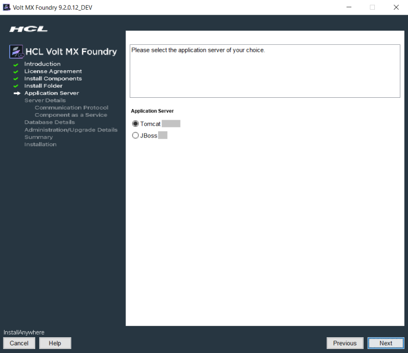 Click Next. The Application Server window appears asking you to choose the application server. By default, the Application Sever is set to Tomcat.
