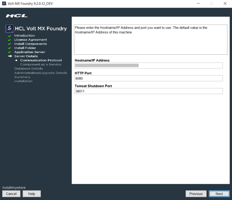 * **Database Server Hostname/IP**: Enter the DB server Hostname/IP to be used to create a database of selected components of Volt MX Foundry. By default, the server Hostname/IP is set as localhost.