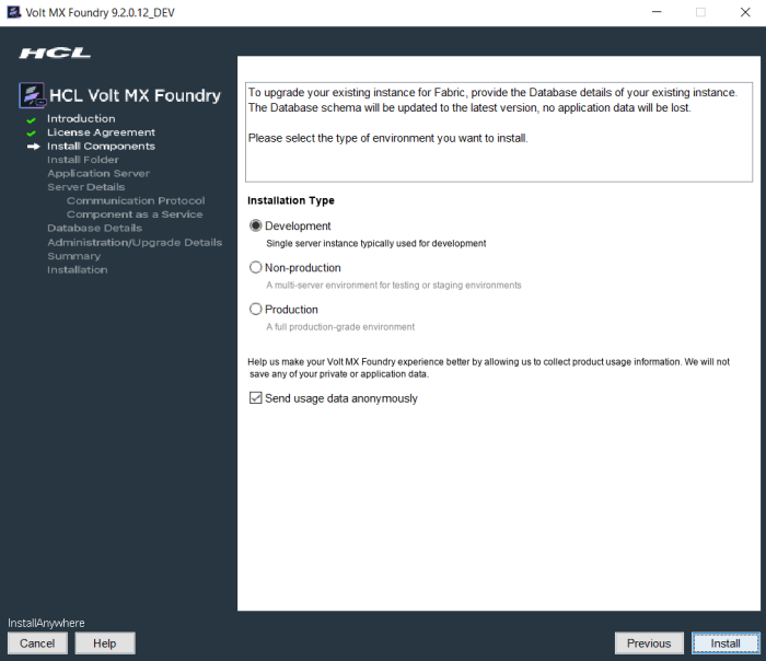 Select the Send usage data anonymously check box. This allows HCL to collect product usage information to make your Volt MX Foundry experience better. HCL does not save any of your private or application data. By default this check box is selected.