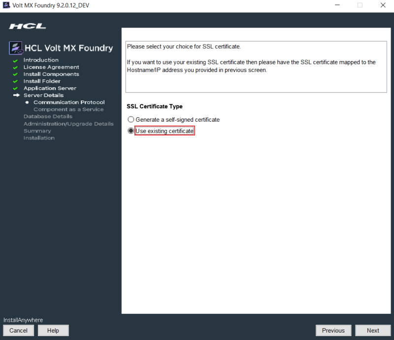 After you configure the application server details in the HTTP or HTTPS window, click Next. The SSL Configuration for HTTPS Communication option appears only if you select HTTPS. By default, the Generate a self-signed certificate option is selected. Choose one of the following two options: