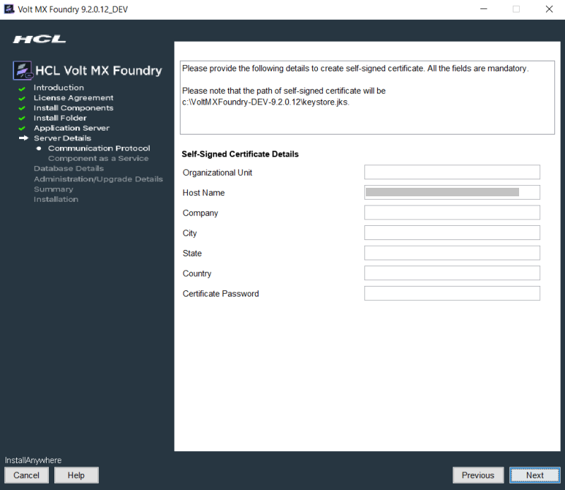 Certificate Password: Enter the password for the .jks file that the installer will generate.