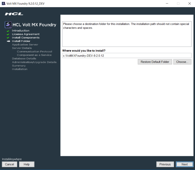 Click Next. The Install Folder window appears. The selected path appears in the Where would you like to install field.
