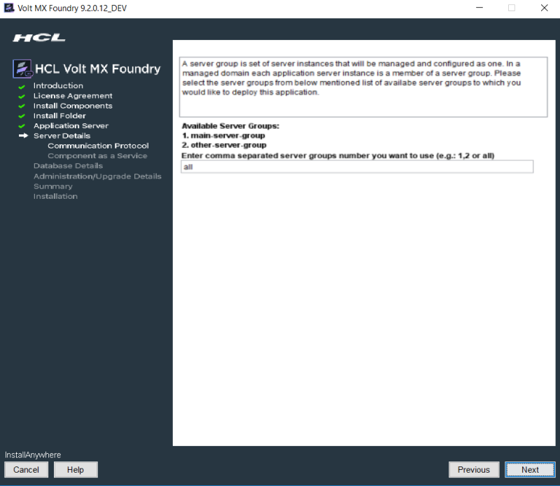 Enter server groups separated by commas - for example, 1, 2, shown above. Click Next. The system displays the selected groups in the Selected Server Group window.