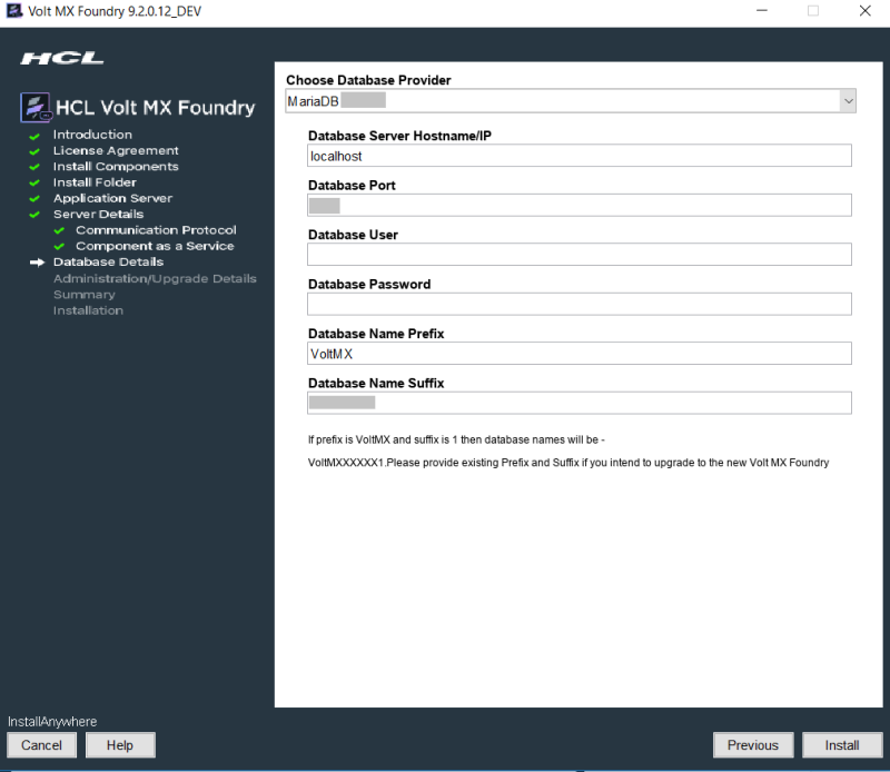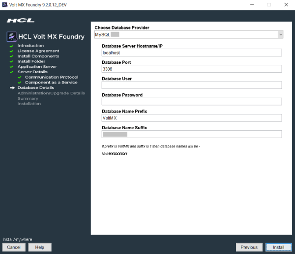 * **Database Name Prefix**: Enter valid prefix databases - for example, Volt MX.