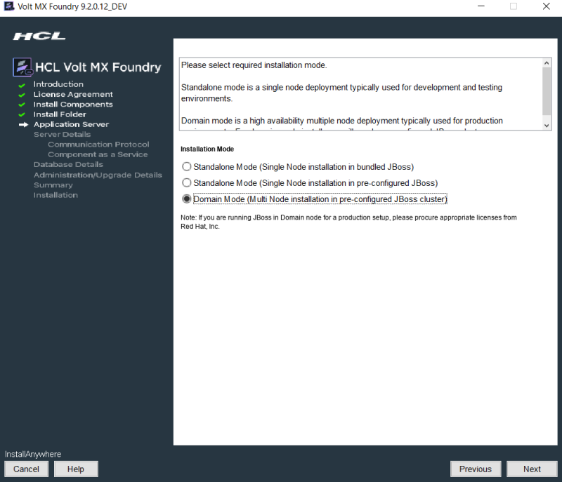 Important: To install Volt MX Foundry on single-node on JBoss that is bundled with the Volt MX Foundry installer, choose 1- Standalone Mode (Single Node). For more details, refer to Installing Volt MX Foundry on JBoss - Single Node.