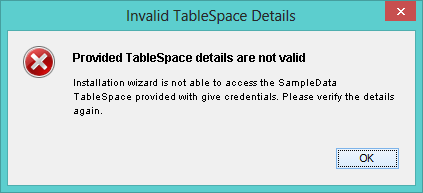If the Data tablespace (for example, SampleData) does not exist, the installers displays the error message: