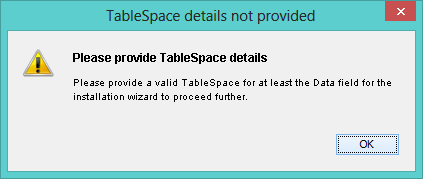 Enter the name for Data tablespace.This is a mandatory field. If the Data tablespace field empty, the installers displays the error message: