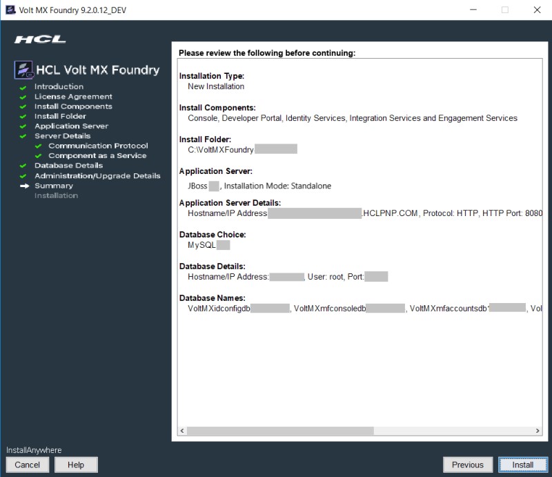 The system creates the following databases:<prefix>mfconsoledb<suffix>,<prefix>mfaccountsdb<suffix>, and<prefix>mfreportsdb<suffix>. - Identity Services - To install Volt MX Identity Services, select the Identity Services check box.