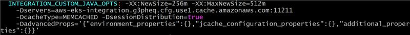 -Dservers=<Integration Memached cluster hostname:port>-DcacheType=MEMCACHED-DsessionDistribution=true-DadvancedProps='{"environment_properties":{},"jcache_configuration_properties":{},"additional_properties":{}}'