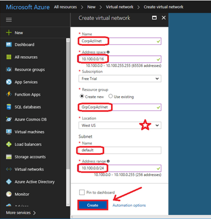 - Address space: Provide a subnet IP Address and ensure that it does not overlap with your on-premises IP address space. Pick an address that is outside the range of your local subnets.For example, 10.100.0.0/16.
