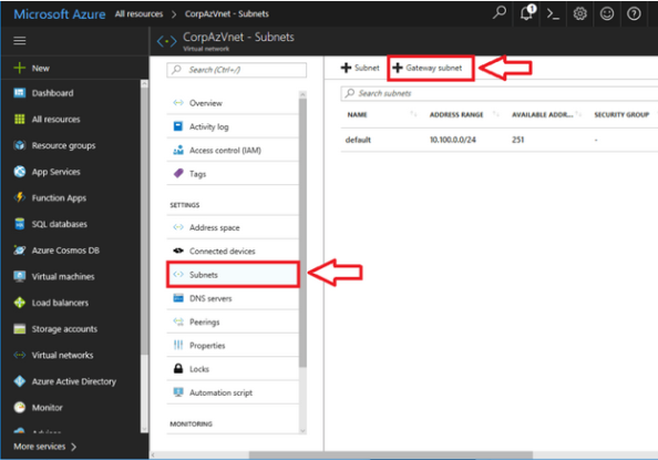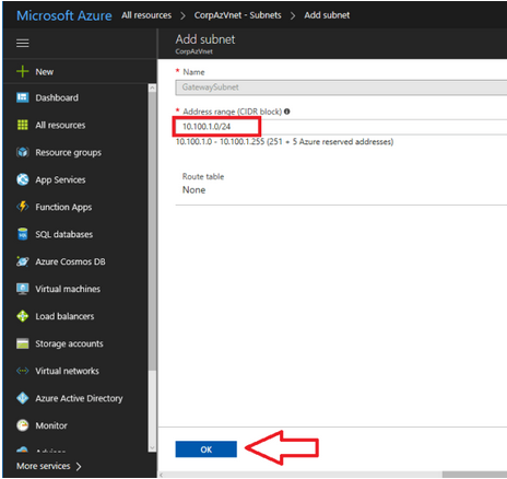 Note: Azure picks an address range within the space you previously defined. In the given example, it uses 10.100.1.0/24 as the GatewaySubnet. You cannot pick any other name as this is how Azure knows what the subnet is for.