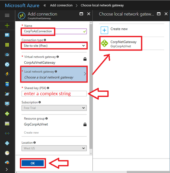 Site-to-Site (IPSec). - Local network gateway: Select the Local network gateway that you created.