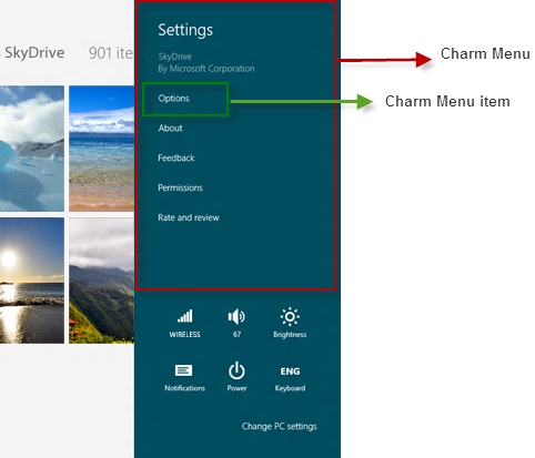 The Charm Setting API enables you to create a Charm menu, add and remove the Charm menu items.