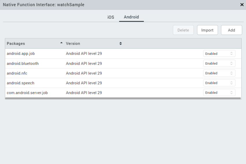 Navigate to Native > Android tab, and select Enable Native Function APIs (NFC, JobScheduler, Speech, Bluetooth).