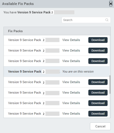 Note: The Available Fix Packs dialog box only displays the Fix Packs that are available on the current version.