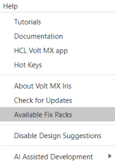 From the Help menu of Volt MX Iris, click Available Fix Packs.