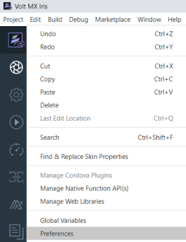 - From the Edit menu of Volt MX Iris, click Preferences.
