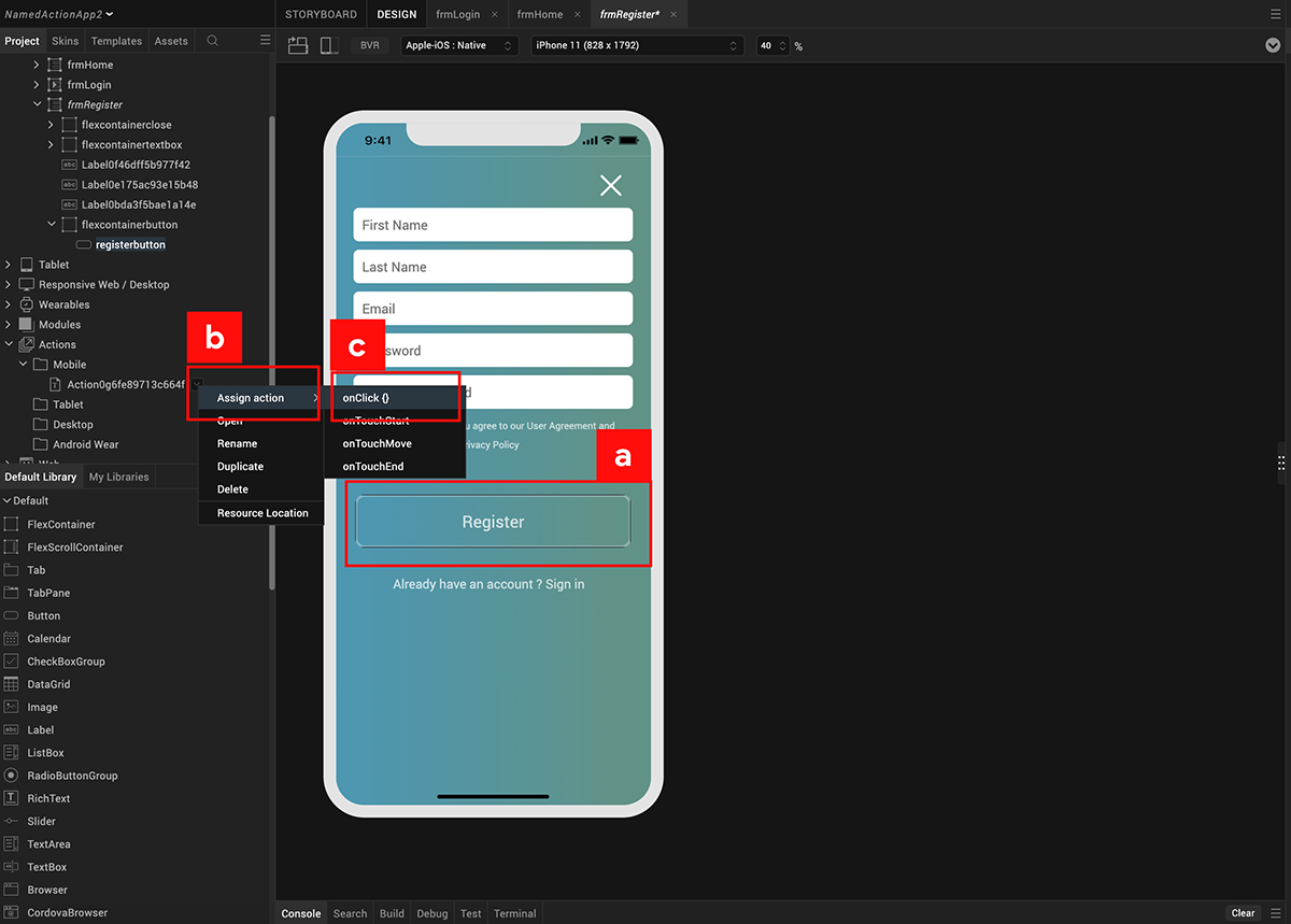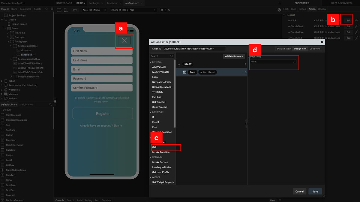 Select Call Action from the action library to build the desired action sequence for the On-Click event.