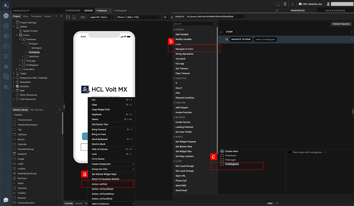 All the configurable properties for the selected action are shown in the bottom pane, choose the required form to Navigate to. Select the URL option to render remotely hosted web content.