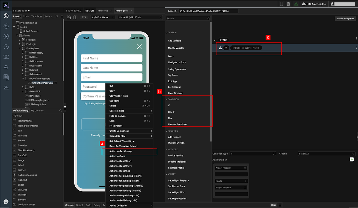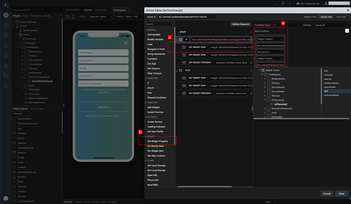 Configure the expression for the If condition. If the Widget Property confirmpasswordtxt.text is Not Equal to passwordtxt.text.